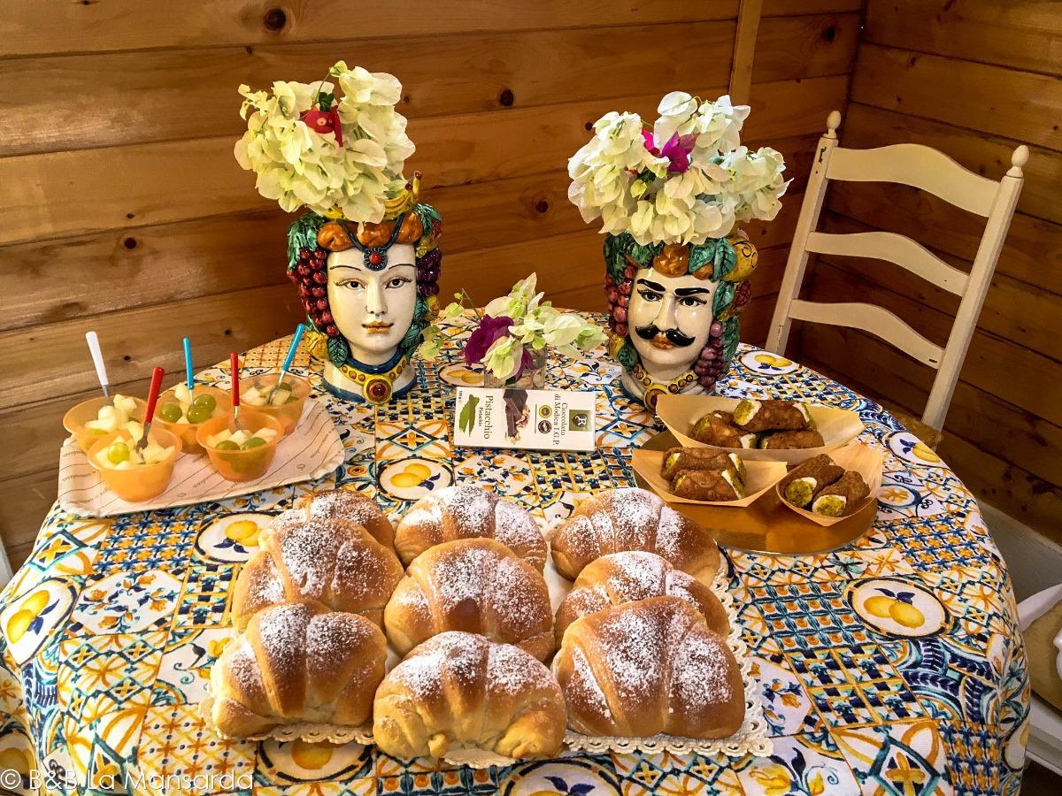 Le nostre colazioni sono molto esaustive, puntiamo a farvi assaporare i gusti intensi della nostra Sicilia, proponendovi ogni giorno pietanze diverse e gustose, in grado di accontentare qualsiasi palato. In particolare saranno sempre presenti: frutta fresca di stagione, proveniente dalle zone circostanti o dal nostro vivaio; dolci fatti in casa di buon mattino; prodotti tipici della zona del Ragusano.